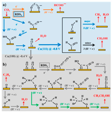 ![]() Figura 8. Possíveis caminhos reacionais para a redução eletrocatalítica de CO2 em diferentes produtos por catalisadores metálicos: (a) redução de CO2 em CO, CH4 (setas azuis), CH3OH (seta preta) e HCOO− (setas laranja); (b) redução de CO2 em etileno (setas cinza) e etanol (setas verdes). As espécies em preto são adsorbatos, enquanto àquelas em vermelho são reagentes ou produtos em solução. Os potenciais são relatados em relação a EPH, RDS significa etapa determinante de velocidade, enquanto (H+ + e−) indica etapa na qual ocorre a transferência de próton-elétron combinada ou separada. Reprinted with permission from ref.212 Copyright 2015 American Chemical Society