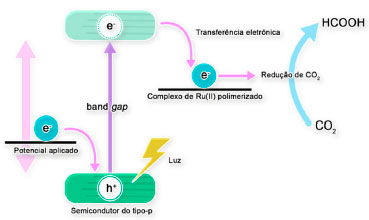 Foi também descrita uma célula fotoeletroquímica em meio aquoso, empregando o complexo fac-[Re(bh-bpy)(CO)3(OH2)] (bh-bpy = 4,4'-dihidroximetil-2,2'-bipiridina) no fotocátodo, e IrO2/FTO no anodo. Os autores obtiveram eficiências faradaicas de 95 e 4% para conversão de CO2 em CO e HCOOH, respectivamente a pH = 6,9. Mesmo em pHs ligeiramente ácidos, 4,2, o sistema apresentou uma boa seletividade para CO (84%) gerando apenas 3% de HCOOH. Apesar dos relevantes avanços até o momento, o desempenho energético e faradaico na conversão de CO2 em produtos de interesse é ainda aquém do esperado para uma aplicação pratica. Isso se deve a dois fatos basicamente: i) complexidade do sistema, pois deve ser acoplado e otimizado dois processos diferentes, sendo que nem sempre as condições ótimas de ambos se sobrepõem; ii) a característica eletrônica intrínseca aos semicondutores limita severamente a densidade de corrente que pode ser obtido em um sistema como esse. Portanto, esforços precisam ser investidos nessa área para que ambos os processos sejam otimizados.