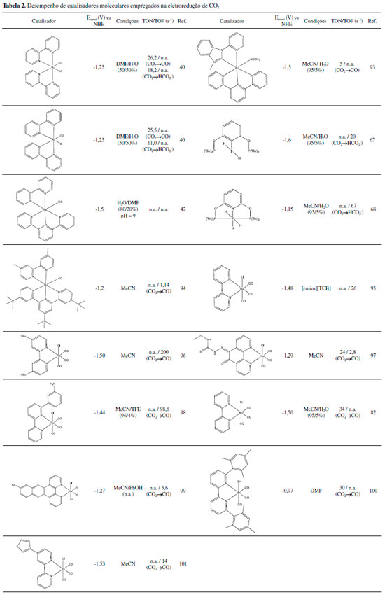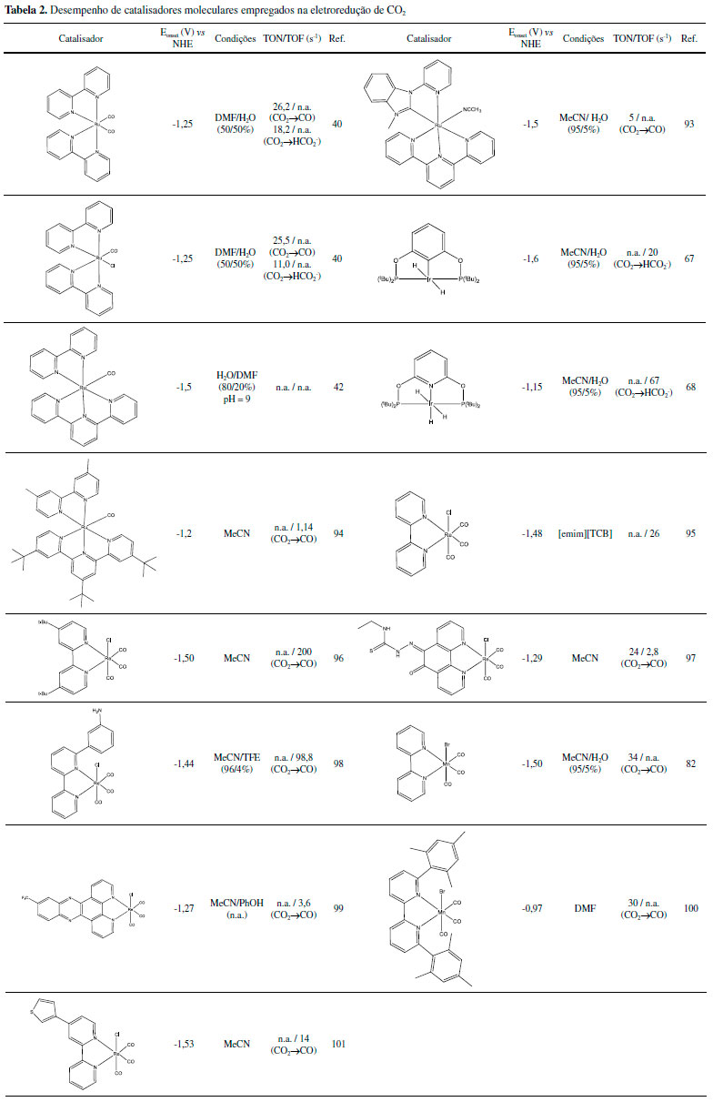 Apesar desses catalisadores possuírem alto desempenho, as condições de catálise (temperaturas e pressão) são extremas, um agravante em termos práticos.61 Assim, busca-se também empregar complexos de Ir(III) como fotocatalisadores. Apesar desses possuírem ampla faixa de absorção de luz visível e tempo de vida do estado excitado relativamente longo e centrado em estados 3MLCT, apenas recentemente um fotocatalisador baseado em complexos de Ir(III) foi reportado.29,64 O mecanismo de ação é similar aos complexos de Ru(II), envolvendo a supressão redutiva do estado 3MLCT, seguido pela formação de um metal hidreto responsável pela ativação do CO2.65 Os complexos de Ir(III) também podem ser ativados eletroquimicamente,66 com sobrepotenciais que variam entre -0,87 a -1,6V vs NHE e TOF de até 20s-1, sendo formato (HCOO-) o principal produto gerado.65,67-69 Rênio Complexos do tipo fac-[Re(N,N)(CO)3X] (N,N = 2,2'-bipiridina ou 1,10-fenantrolina; X = Cl ou Br) foram propostos como substitutos para [Ru(bpy)3]2+ na fotorredução de CO2.69 Esses complexos apresentam maior seletividade frente a outras reações como evolução de H2, mas possuem menor absorção na região visível. Houve maior investigação das propriedades desses compostos, principalmente, variando os ligantes polipiridínicos,70-77 como por exemplo, a inserção de um grupo aquo como ligante, que permite a solubilização em água mantendo boa atividade eletrocatalítica.75,78,79 Nesses casos o mecanismo de redução de CO2 segue as mesmas premissas descritas para os complexos de Ru(II): o composto é fotorreduzido por um doador de elétrons (D), levando a labilização do ligante ancilar e a formação de um aduto com o CO2. A natureza desse aduto tem sido alvo de intensas investigações mecanísticas75 e depende tanto do meio de reação, bem como do agente de sacrifício empregado. Os complexos de Re(I) também podem atuam como eletrocatalisadores.80 Nesse caso, a aplicação de potenciais catódicos leva tipicamente à redução do ligante N,N e em seguida a redução do centro metálico com consequente dissociação do ligante ancilar. O CO2 associa-se ao centro metálico sendo reduzido a CO ou HCOOH, dependendo do meio e do complexo utilizado. Manganês Catalisadores polipiridínicos de Mn(I) são desejáveis, em comparação a seus análogos de Re(I), devido à maior abundância do manganês e menor custo. Johnson e colaboradores estudaram o complexo fac-[Mn(bpy)(CO)3X] na conversão de CO2, relatando que em THF anidro e em MeCN anidro os mesmos não possuíam atividade, devido a formação de radicais fac-[Mn(bpy)(CO)3], que posteriormente se reduz a fac-[Mn(bpy)(CO)3]-, formando o dímero fac-[Mn(bpy)(CO)3]2.81 Deronzier e colaboradores, relataram o emprego de complexos polipiridínicos de Mn(I), de forma molecular fac-[MnBr(bpy)(CO)3], na eletrocatálise de CO2 em CO em MeCN/H2O (95/5%).82 Nessa vertente, não podemos desconsiderar a semelhança dos complexos fac-[MnBr(bpy)(CO)3] e fac-[ReCl(bpy)(CO)3]. Kubiak e colaboradores elucidaram a eletrocatálise de CO2 comparando os dois complexos.83 Observou-se que o complexo fac-[MnBr(bpy)(CO)3] não atua como a espécie catalítica ativa na redução do CO2 em CO; em vez disso, há a redução de um elétron e a perda do ligante brometo, formando o dímero [Mn2(bpy)2(CO)6], seguido por uma redução subsequente de um elétron para produzir o catalisador ativo, [Mn0(bpy)(CO)3]-. Foi observado também que os catalisadores de manganês reduzem o CO2 em um sobrepotencial marcadamente menor (um ganho de 0,40 V). Também foi relatada a utilização desses complexos na redução de CO2 em ácido fórmico, empregando TEOA como agente de sacrifício.84 O complexo fac-[MnBr(bpy)(CO)3] e seus derivados continuam a ser intensivamente estudados para a eletrocatálise homogênea de CO2 a produtos de maior valor agregado.85-87 Há ainda estudos utilizando ligantes que apresentam frações de coordenação alternativas, como os carbenos imino-N-heterociclicos (NHC). Os ligantes NHC são versáteis possuindo tanto o nitrogênio quanto o carbono como sítios de coordenação. O carbono confere um caráter σ doador mais forte em comparação à piridina e pode resultar em um aumento do gap, HOMO - LUMO, portanto, um deslocamento catódico dos potenciais de redução de um e dois elétrons.85,88 O uso de complexos polipiridínicos de Mn(I), por exemplo fac-[MnBr(bpy)(CO)3], na fotorredução de CO2 apresentou melhores resultados com a utilização do complexo Ru(bpy)32+ como fotossensibilizador e BNAH como agente de sacrifício em DMF/TEOA (TONHCOOH = 157).84 A partir daí, diversos estudos se deram envolvendo investigações mecanísticas,89 uso de novos sensitilizadores90 ou variação da estrutura do catalisador.91 As Tabelas 2 e 3, listam respectivamente exemplos de eletro e fotocatalisadores baseados em complexos de Ru(II), Ir(III), Re(I) e Mn(I). Em cada tabela são apresentados valores de TON e TOF, bem como as condições experimentais em que os dados foram obtidos. Uma vez que as condições experimentais entre os diferentes trabalhos variam significativamente, comparações diretas dos valores numéricos podem levar a conclusões errôneas a respeito da estabilidade/eficiência de cada um dos catalisadores. De forma geral, pode-se observar que os valores de TON para eletrocatalisadores moleculares são relativamente baixos em relação a sistemas heterogêneos, o que pode ser explicado pela ocorrência de reações secundárias como a dimerização.92 Já para os sistemas fotocatalíticos, Tabela 3, os valores de TON podem ser até duas ordens de grandeza maiores, uma vez que há excesso de agente de sacrifício no meio em relação ao fotocatalisador, o que minimiza a ocorrência de reações secundárias. Ainda assim, a estabilidade do sistema é considerada baixa para aplicações reais. Uma das formas de se contornar tal situação é a heterogeneização do