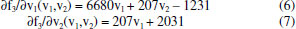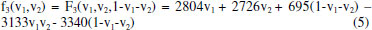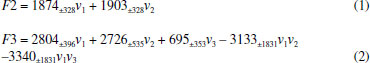 A parte esquerda da linha de comando corresponde aos outputs (saídas) obtidos após o tratamento dos dados pela rotina regression2. Mod_par corresponde a tabela ANOVA (Analysis of Variance) considerando 95% de confiança, Coef aos coeficientes obtidos com seus respectivos intervalos de confiança e Pred corresponde aos valores previstos para cada experimento. Pereira e Pereira-Filho8 fornecem uma explicação detalhada da rotina utilizada. O primeiro passo foi calcular um modelo de regressão para cada resposta a fim de verificar quais coeficientes de regressão são significativos, isso é, valores maiores que seus respectivos intervalos de confiança. O Material Suplementar mostra as tabelas Anova para as respostas F2 (Tabela 1S) e F3 (Tabela 2S). Além disso, as informações dos modelos são também mostradas na forma de figuras (Figuras 1S e 2S). Para a resposta F2 apenas os coeficientes b1 e b2 foram significativos (Figura 1S), já para a resposta F3, b1, b2, b3, b12 e b13 foram válidos (Figura 2S). Todas as avaliações foram feitas ao nível de confiança de 95%. A rotina regression2 foi aplicada novamente para ambas as respostas utilizando somente os coeficientes válidos. Mesmo com a exclusão dos coeficientes não significativos para cada uma das respostas, não foram identificadas réplicas, isso é, mais de um experimento com as mesmas condições, não sendo possível o cálculo de SSPE e DF. A Figura 2, a Tabela 3 e a Equação 1 mostram os resultados obtidos após o refinamento do modelo para a resposta F2. E a Figura 3, Tabela 4 e Equação 2 descrevem os resultados para a resposta F3. ![]()
