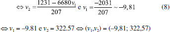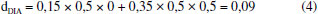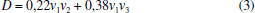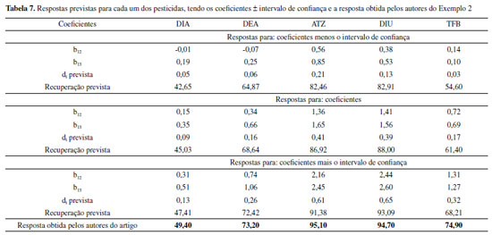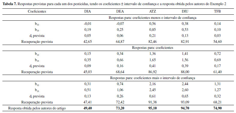 Na Tabela 7, tem-se o resultado das respostas previstas para cada um dos pesticidas, onde empregou-se o modelo global com os coeficientes b12 e b13. Assim, utilizou-se os valores desses coeficientes (b12 e b13) dos modelos individuais calculados no início do tratamento dos dados para encontrar a di (desejabilidade individual) de cada um dos pesticidas em todos os níveis (coeficiente ± intervalo de confiança) e consequentemente, a resposta prevista. Para a di prevista, utilizou-se a Equação 3 com os devidos coeficientes significativos para cada nível e cada resposta, como pode ser observado no exemplo (Equação 4) para o pesticida DIA: ![]()