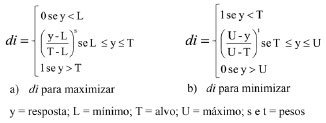 ![]() Figura 1. Equações para o cálculo da desejabilidade quando o objetivo é (a) maximizar e (b) minimizar