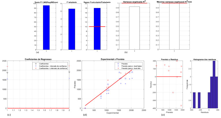 ![]() Figura 2. Teste F para a média quadrática de regressão (MQR) e média quadrática de resíduo (MQres) (a), variação explicada (R2) e explicável (R2max) (b), coeficientes de regressão (c), gráfico dos valores experimental versus previsto (d), previsto versus o resíduo e histograma dos resíduos (e), para os cálculos da resposta F2 após o refinamento do modelo