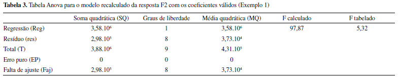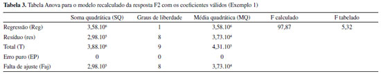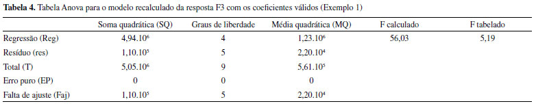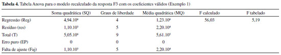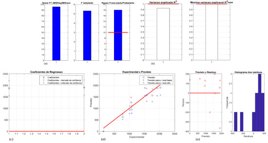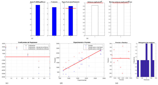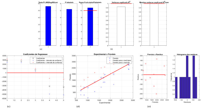 ![]() Figura 3. Teste F para MQR e MQres (a), variação explicada (R2) e explicável (R2max) (b), coeficientes de regressão (c), gráfico dos valores experimental versus previsto (d), previsto versus o resíduo e histograma dos resíduos (e), para os cálculos da resposta F3 após o refinamento do modelo