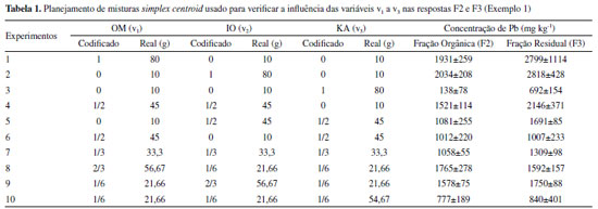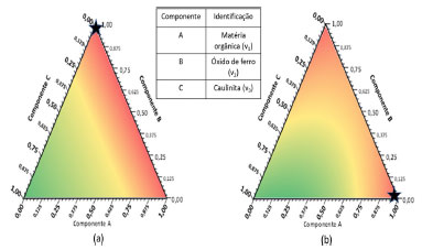 Nas Equação 1 e 2, v1, v2 e v3 são relativos à matéria orgânica, óxido de ferro e caulinita, respectivamente. Ambas as equações descrevem uma superfície de resposta com as três variáveis interrelacionadas. O ponto "ótimo" da superfície descrita pela equação representa as proporções de v1, v2 e v3 em que as respostas encontram seus valores "ótimos", ou seja, região onde se observa maior fração de massa (concentração) de Pb nas frações orgânica (F2) e residual (F3), respectivamente. Os modelos obtidos foram analisados em um template preparado no Excel, que tem como finalidade a obtenção de um gráfico de contorno a partir dos valores dos coeficientes obtidos em um modelo de regressão. As Figuras 4a e 4b mostram os gráficos de contorno obtidos para F2 e F3, respectivamente. Analisando os gráficos obtidos é possível observar as proporções das pseudocomponentes que resultam em maior teor de Pb, em vermelho, e as proporções que resultam em menor teor de Pb, em verde.