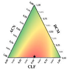O modelo de regressão é calculado pela rotina "regression2" disponibilizada em Pereira e Pereira-Filho,8 a partir do qual é possível calcular e avaliar a Tabela Anova. Após o cálculo, apenas dois coeficientes foram significativos: b12 e b13. Assim, o modelo foi recalculado apenas com os coeficientes válidos, onde quatro réplicas foram identificadas permitindo obter a soma quadrática do erro puro. Na Tabela 3S, tem-se a tabela Anova para o modelo recalculado e na Figura 3S (ver ambos no Material Suplementar) tem-se os valores da razão do teste Fcalculado e Ftabelado para a falta de ajuste (a) e para a regressão (b), além da variância explicada do modelo (c). Ao analisar o resultado da razão do primeiro teste Fcalculado (MQFaj/MQEP) e Ftabelado, tem-se que o Fcalculado é menor que o Ftabelado, em que os dois se confundem, portanto, o modelo não apresenta falta de ajuste (razão menor que 1, Figura 3Sa). Além da falta de ajuste, é necessário verificar a regressão do modelo, sendo que, nesse caso, a razão entre o Fcalculado (MQReg/MQres) e o Ftabelado está na faixa de 4,5 (Figura 3Sb), ou seja, a regressão é maior que o resíduo. Esse aspecto reflete que o modelo está adequado, porém, a situação ideal é que a razão dos valores de F fosse acima de dez.14 Os parâmetros utilizados para os cálculos do teste F são encontrados na Tabela Anova (Tabela 3S). A variância explicada do modelo está na faixa de 0,6 (Figura 3Sc), o que pode afirmar que o modelo não é excelente, mas por outro lado é possível utiliza-lo para identificar uma condição de compromisso que poderá apresentar valores de recuperação adequados para todos os analitos. Assim, o modelo final foi: ![]() em que v1, v2 e v3 são CLF, DCM e ACN, respectivamente. D é a resposta (no caso, a desejabilidade global). Nota-se que apenas os coeficientes quadráticos foram significativos. Na Figura 5, tem-se o gráfico de contorno com os coeficientes significativos, no qual observa-se uma região de ótimo na coloração vermelha da figura, resultando em 0,5 das variáveis 1 (CLF) e 3 (ACN) e 0 da variável 2 (DCM), ou seja, uma mistura "ideal" seria 50% de CLF e 50% de ACN, e 0% de DCM. A condição identificada pelos autores do trabalho foi: 47,5% de CLF e 47,5% de ACN, e 5% de DCM, ou seja, mesmo com diferentes abordagens para o tratamento de dados, os resultados foram praticamente os mesmos. O gráfico foi feito com o template de misturas no Excel disponibilizado neste tutorial.