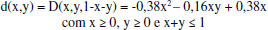 Lembrando que v1 = 0,5; v2 = 0 e v3 = 0,5. A recuperação prevista (y) foi calculada de acordo com a equação da Figura 1a. Nesse caso, tem-se a di prevista e o novo y será a resposta prevista em termos de recuperação. Ao observar a resposta do artigo (Tabela 7), tem-se valores muito semelhantes com os resultados obtidos no maior nível (coeficiente mais o intervalo de confiança). Vale ressaltar que ambos os trabalhos utilizaram abordagens diferentes e com isso os resultados podem ser considerados equivalentes. Encontrando a região de ótimo usando ferramentas de cálculo diferencial A identificação da região ótima de trabalho de determinado modelo não é uma tarefa fácil e pode trazer dificuldades consideráveis de acordo com os coeficientes válidos do modelo. Para o caso da Equação 1, por exemplo, a região em que há a máxima retenção de Pb está na aresta em que a variável 2 (óxido de ferro) é máxima (1,0). Nesse ponto, a fração de massa prevista para o Pb é de 1903 mg kg-1. Essa constatação corrobora com a aplicação do Solver do Microsoft Excel®. Para o caso do modelo obtido para a resposta F3 (Equação 2), podemos calcular as derivadas parciais em função das variáveis v1 e v2 e substituir a v3 por 1-v1-v2: ![]() As derivadas parciais são: ![]() (v1,v2) é o ponto crítico de f3 ⇔ ∂f3/∂v1(v1,v2) = 0 e ∂f3/∂v2(v1,v2) = 0. ![]() Entretanto, esse ponto está fora do domínio T={(v1,v2): v1 ≥ 0, v2 ≥ 0 e v1 + v2 ≤ 1} da função f3. Portanto, novamente aqui, f3 não possui pontos críticos no interior de T. O domínio de F3 é a região plana delimitada pelo triângulo equilátero com vértices (1,0,0), (0,1,0) e (0,0,1), mostrado na Figura 4S (Material Suplementar). O domínio T de f3 é a região plana delimitada pelo triângulo retângulo com vértices (0,0), (1,0) e (0,1), como mostra a Figura 5S (Material Suplementar). Notamos que o bordo de T é dado pela união dos segmentos a, b e c (dados em vermelho, azul e verde, respectivamente, ver Figura 5S). Precisamos analisar os candidatos a ponto de máximo de f3 no bordo de T. 1) Em a = {(v1,v2) ∈ T: v1 ≥ 0, v2 ≥ 0 e v1+v2 = 1} Nesse caso, analisamos os pontos de máximo da função g1:[0,1]→[0,1], definida por g1(v1) = f3(v1,1-v1) = 3133v12 - 3055v1 + 2726, a qual tem um único ponto crítico v1 = 235/482 ~ 0,49 ∈ (0,1). Assim, nesse caso, os candidatos a ponto de máximo de F3 são, (0,49, 0,51, 0), (0,1,0) e (1,0,0). 2) Em b = {(0, v2) ∈ T: 0 ≤ v2 ≤ 1} Nesse caso, analisamos os pontos de máximo da função g2:[0,1]→[0,1], definida por g2(v2) = f3(0,v2) = 2031v2 + 695, a qual não possui pontos críticos. Logo, nesse caso, os candidatos a ponto de máximo de F3 são (0,0,1) e (0,1,0). 3) Em c = {(v1,0) ∈ T: 0 ≤ v1 ≤ 1} Nesse caso, analisamos os pontos de máximo da função g3:[0,1]→[0,1], definida por g3(v1) = f3(v1,0) = 3340v12 -1231v1 +695, a qual tem um único ponto crítico x = 1231/6680 ~ 0,18 ∈ (0,1). Assim, nesse caso, os candidatos a ponto de máximo de F3 são, (0,18, 0, 0,82), (0,0,1) e (1,0,0). Agora testamos todos os candidatos: F3 (0,49, 0,51, 0) = 1981 Logo, o ponto de máximo procurado é (1, 0, 0), ou seja, a variável 1 (v1 = Matéria Orgânica) no nível alto (1). Para o caso do exemplo 2, no qual o modelo obtido é aquele mostrado na Equação 3, precisamos determinar o ponto de máximo absoluto da função ![]() Chamando v1 = x, v2 = y e v3 = z temos, ![]() Isso é equivalente à: ![]() O ponto de máximo da função d ocorre entre os pontos críticos de d no interior de T = {(x,y): x ≥ 0, y ≥ 0 e x+y ≤ 1} e os pontos críticos do bordo de T, ou seja, b(T) = {(x,y): x = 0 ou y = 0 ou x+y = 1}. Pontos críticos no interior de T (x,y) é ponto crítico de d ⇔ ∂d/∂x(x,y) = -0,76x - 0,16y + 0,38 = 0 e ![]() Como o ponto (0, 2,38) não pertence ao conjunto T (e, portanto, não pertence ao interior desse conjunto), temos que d não possui candidatos a ponto de máximo absoluto no interior de T. Pontos críticos no b(T) 1) x = 0 Nesse caso, analisamos os pontos de máximo da função f1:[0,1]→[0,1], definida por f1(y) = d(0,y) = 0. Como essa é uma função constante, todos os pontos (0,y) são candidatos a ponto de máximo de d, ou seja, todos os pontos (0, y, 1-y) com 0 ≤ y ≤ 1 são candidatos a ponto de máximo de D. 2) y = 0 Nesse caso, analisamos os pontos de máximo da função f2:[0,1]→[0,1], definida por f2(x) = d(x,0) = 0,38(x-x2), a qual tem um único ponto crítico x = 1/2 ∈ (0,1). Assim, nesse caso, os candidatos a ponto de máximo de D são, (½ , 0 , ½ ), (0,0,1) e (1,0,0). 3) x+y = 1 Nesse caso, analisamos os pontos de máximo da função f3:[0,1]→[0,1], definida por f3(x) = d(x,1-x) = 0,22(x-x2), a qual tem um único ponto crítico x = 1/2 ∈ (0,1). Assim, nesse caso, os candidatos a ponto de máximo de D são (½, ½, 0), (0,1,0) e (1,0,0). Agora testamos todos os candidatos: D (0, y, 1-y) = D (0, 0, 1) = D(0, 1, 0) = 0 Logo, o ponto de máximo procurado é (½, 0, ½). Assim, as variáveis v1 (CLF) e v3 (ACN) devem ser 50% de cada.