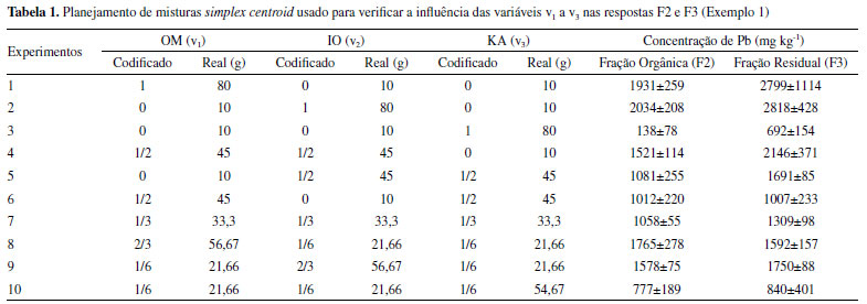 PARTE EXPERIMENTAL Descrição dos conjuntos de dados empregados Para exemplificar as ferramentas deste tutorial, foram selecionados dois conjuntos de dados a partir de trabalhos publicados no periódico Journal of the Brazilian Chemical Society (JBCS). A utilização desses estudos, bem como o conjunto de dados neles publicados, foi gentilmente cedida pela Editora da Sociedade Brasileira de Química (PubliSBQ). Tais artigos foram selecionados por utilizarem planejamento de misturas objetivando a resolução de diferentes problemas analíticos. Exemplo 1 No primeiro exemplo foi utilizado o trabalho publicado por Damasceno et al.,9 no qual os autores utilizaram um planejamento de misturas do tipo simplex centroide para visualizar a relação do chumbo presente em descarte de material eletrônico (placas de circuito impresso) com diferentes tipos de solos. Nesse caso, cada pseudocomponente foi avaliado em 6 níveis. A Tabela 1 mostra em detalhes o planejamento experimental utilizado pelos autores com três variáveis, OM (v1 - matéria orgânica), IO (v2 - óxido de ferro) e KA (v3 - caulinita), além de duas respostas que serão estudadas neste tutorial, F2 (concentração de Pb extraído na fração orgânica) e F3 (concentração de Pb extraído na fração residual). No experimento 1, por exemplo, da Tabela 1 temos uma mistura composta por 80 g (codificado em 1) de matéria orgânica (OM) e 10 g de cada um dos demais componentes: óxido de ferro (IO, codificado em 0) e caulinita (KA, codificado em 0).