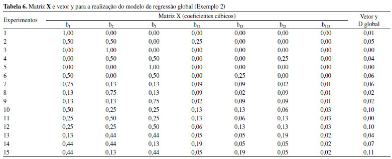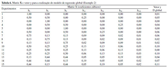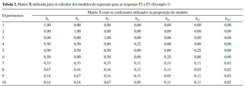 RESULTADOS E DISCUSSÃO Exemplo 1 No primeiro exemplo estudado os autores monitoraram como as diferentes proporções de matéria orgânica (v1), óxido de ferro (v2) e caulinita (v3) influenciam na absorção de Pb por uma amostra de solo. As concentrações de Pb utilizadas são aquelas que podem ser encontradas devido ao descarte inadequado de material eletrônico. Segundo os autores, foram realizadas 3 réplicas em cada nível experimental, entretanto, são mostrados apenas o valor médio e desvio padrão obtido. Para avaliar como os pseudocomponentes interferiram nas respostas avaliadas utilizou-se a rotina regression2, a qual foi proposta por Pereira e Pereira-Filho8 e tem a finalidade de calcular um modelo de regressão a partir de 4 dados de entrada (inputs): as matrizes X e Y, a soma quadrática do erro puro (pure error sum of squares - SSPE) e seu respectivo grau de liberdade (degree of freedom - DF). A linha de comando para a utilização da rotina regression2 é: ![]() Na parte direita da linha de comando pode-se observar os inputs. A matriz X dá origem aos coeficientes de regressão (Coef) a serem calculados e possui m linhas e n colunas, onde as linhas correspondem aos experimentos e as colunas aos coeficientes de regressão que serão calculados, essa matriz pode ser vista em detalhes na Tabela 2. Os coeficientes calculados para ambas as respostas avaliadas foram: b1, b2, b3, b12, b13, b23, b123. Os três primeiros coeficientes, b1, b2 e b3, são obtidos a partir dos níveis codificados das variáveis v1, v2 e v3, mostrados na Tabela 1, o coeficiente b12 é obtido pela multiplicação da coluna correspondente ao coeficiente b1 pela coluna correspondente ao coeficiente b2. Os demais coeficientes são obtidos de forma análoga. A matriz Y corresponde aos resultados obtidos em cada experimento realizado, dessa forma será composta por m linhas e n colunas, onde as linhas correspondem aos experimentos e as colunas, as respostas monitoradas (F2 e F3, Tabela 1). SSPE corresponde a soma quadrática do erro puro obtida a partir das réplicas, porém, nesse caso não foi possível o cálculo desse parâmetro devido à ausência desses valores, sendo considerado 0. Na utilização da rotina regression2 é calculado um modelo para cada resposta. Dessa forma, recomenda-se o desmembramento da matriz Y em n vetores (as n respostas avaliadas).