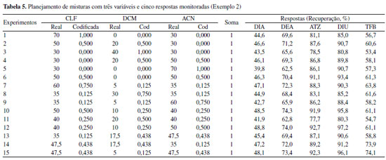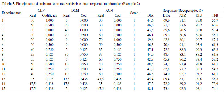 Além do template descrito também foi utilizado a ferramenta do Solver no Excel para avaliar os modelos obtidos. Uma descrição detalhada deste recurso e sua utilização podem ser encontrados no tutorial anterior8 e na Playlist de número 7 que descreve o uso do Solver (https://www.youtube.com/playlist?list=PL4CuftF4l_fB7LRMzFBmw59FrigmAb0hy). As proporções que resultaram em maior teor de Pb na F2 do solo são: 10% de matéria orgânica (v1), 80% de óxido de ferro (v2) e 10% de caulinita (v3). No caso da F3, a melhor condição exige que a v1 esteja no nível máximo. Para melhor entendimento do processo de tratamento de dados descrito neste trabalho foi elaborada uma lista de vídeos explicativos de livre acesso publicados no YouTube (https://www.youtube.com/playlist?list=PL4CuftF4l_fDBW0qIJ1gXZneN1Krgw5z_). Exemplo 2 Na Tabela 5, tem-se o planejamento de misturas utilizado pelos autores com três variáveis (CLF, DCM e ACN), onde as proporções das condições escolhidas variaram de 0 a 1 quando convertidas em pseudocomponentes. As codificações de cada uma das variáveis são mostradas, sendo que a soma entre elas é 1. As respostas monitoradas são apresentadas na forma de recuperação dos cinco pesticidas determinados.