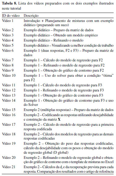 CONCLUSÕES Com este tutorial é possível aprender de forma didática como realizar o tratamento de dados de um planejamento de misturas para duas e múltiplas respostas. Também foi elaborado um template no Excel para a construção de gráfico de contorno e superfície de resposta com os resultados dos modelos de regressão de misturas, os quais são disponíveis apenas em programas computacionais pagos e restritos. O uso do Solver também foi exemplificado neste tutorial, sendo uma ferramenta gratuita que pode ser utilizada no Excel. Além disso, uma rotina computacional foi proposta para o cálculo das desejabilidades. A Tabela 8 mostra uma lista com os vídeos elaborados para a construção deste tutorial. Os vídeos são curtos e mostram o passo a passo até a resposta final. No link a seguir é possível acessar a Playlist 15, criada no canal do professor Edenir Pereira Filho no YouTube: https://www.youtube.com/playlist?list=PL4CuftF4l_fDBW0qIJ1gXZneN1Krgw5z_