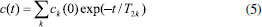![]() Figura 5. Após processamento pelo programa "ilt" é gerada uma nova planilha com duas colunas, uma o eixo dos tempos T e outra com as amplitudes g(T) da ILT. São geradas também quatro figuras onde a) apresenta a distribuição de tempos de relaxação obtida já com eixo na escala logarítmica, b) a comparação entre o sinal de entrada e o fitting resultante (curva em vermelho) e o resíduo e c) os valores singulares resultantes da decomposição SVD