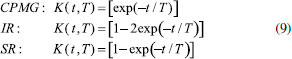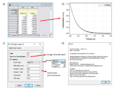 IMPLEMENTAÇÃO DA REGULARIZAÇÃO DE TIKHONOV NO SOFTWARE ORIGIN LAB O programa desenvolvido foi implementando na plataforma do Origin Lab 9, para as equações (kernels) de experimentos do tipo Carr-Purcell-Meiboom-Gill (CPMG), Inversão Recuperação (IR) e Saturação Recuperação (SR), com as seguintes equações ![]() Após instalado o código, deve-se abrir o sinal a ser processado no Origin Lab, que tipicamente são duas colunas, uma de tempo e outra das amplitudes, como mostram as Figuras 4 a) e 4 b). Ao executar o comando "ilt" na linha de comando (command window) do Origin Lab, abre-se uma interface gráfica, apresentada na Figura 4c), na qual se deve fornecer os parâmetros de entrada (inputs) para o processamento do sinal. Na interface define-se o kernel do sinal experimental (função que representa a dependência esperada do sinal para uma dada sequência de pulsos), o parâmetro de regularização (α), a região da solução requerida entre Starting T value e Ending T value, o número total de pontos na distribuição resultante e o valor mínimo do valores singulares.