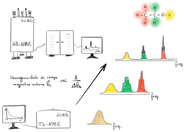 ![]() Figura 1. Ilustração comparando um espectrômetro de RMN de alta resolução (HR-NMR) com um de baixa resolução (TD-NMR). No equipamento HR-NMR a homogeneidade do campo magnético externo ( ) é alta, pois a variação do campo aplicado na amostra é pequena ( ~ 0), assim podemos obter informação à nível molecular nos espectros, por exemplo identificando os três grupos químicos CH3, CH2 e OH no espectro do etanol. Em sistemas magnéticos com ímãs permanentes, de baixa homogeneidade de campo magnético externo, temos > 0, não apresentando resolução no domínio da frequência para identificação dos grupos químicos. A definição de pode ser consultada na referência T.B. Moraes9. Nos espectrômetros de RMN-DT, métodos de relaxometria são empregados e permitem o estudo de diferentes parâmetros físico-químicos