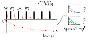![]() Figura 2. Sequência de pulsos CPMG representando os ecos formados em vermelho. As amplitudes dos ecos formam a curva de decaimento T2 do experimento (pontos vermelhos), que é então análisada com métodos de ajuste (fitting) do sinal ou através da Transformada Inversa de Laplace (ILT). Em algumas situações o ajuste ótimo dos dados pode ser obtido com diferentes números de exponenciais e valores de T2 e amplitude, sendo ambas as respostas soluções matemática do problema, uma vez que se trata de um problema matemático mal-posto, que admite mais de uma solução