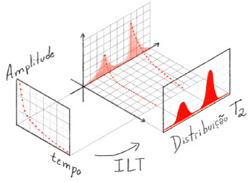 ![]() Figura 3. Ilustração representando o processamento da Transformada Inversa de Laplace (ILT). Na esquerda o sinal do tipo CPMG é representado pelo gráfico das amplitudes dos ecos em função do tempo. Processando esse sinal com a ILT, obtemos o gráfico na direita, que representa a distribuição de tempos de relaxação T2. A informação das posições dos picos de T2 e das áreas dos picos refletem propriedades do material em análise, como distribuição de poros, teor de água/óleo, proporção carne/gordura, entre outros
