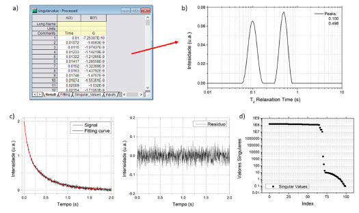 Além do workbook, o processamento gera quatro figuras, apresentadas nas Figuras 5 b)-d). Na Figura 5 b) apresenta-se a distribuição de tempos de relaxação obtidos, já com o eixo x em escala logarítmica; Figura 5 c) a comparação entre o sinal de entrada, o ajuste (fitting) resultante e o resíduo; e Figura 5 d) os valores singulares resultante da decomposição SVD. Detalhes de como instalar o código, e da utilização são apresentados no vídeo que pode ser encontrado no site: https://sites.google.com/view/tiagomoraes ou pelo e-mail tiagobuemoraes@gmail.com.