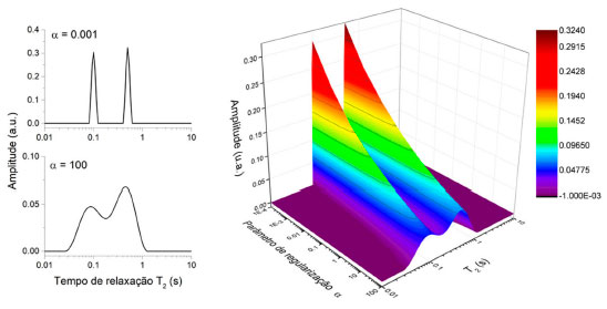 Físicamente é esperado que apenas uma das respostas possíveis seja a correta, pois podemos saber a priori que o sistema tem apenas duas componentes (por exemplo, saber que temos exatamente apenas dois tamanhos de poros, ou duas componentes químicas, etc) e, portanto, o ajuste com três exponencias foi uma solução matematicamente válida para os dados obtidos, porém, incorreta na interpretação física do sistema. Assim, a questão fundamental aqui é que a forma como foram adquiridos os sinais experimentais, nos coloca nesta situação matemática mal-posta, que admite mais de uma solução, em que é necessário algum conhecimento extra sobre o sistema em análise para melhor determinar se, por exemplo, é esperada a solução com duas ou três componentes. Os métodos de matemáticos de regularização, introduzem conhecimentos prévios na análise do sinal, como por exemplo, sabemos que os tempos de relaxação não devem ter valores negativos na RMN, então aceitam apenas soluções não-negativas; sabemos também que nas extremidades (tempos de relaxação muito curto e muito longo) não devem ser encontradas soluções; outra informação que assumimos verdadeira é que a distribuição de tempos de relaxação deve ter uma forma contínua, não sendo esperado encontrarmos distribuições descontínuas de tempos de relaxação, entre outras informações que podem ser assumidas na procura da solução mais realista. Transformada Inversa de Laplace Em muitas análises de dados de RMN-DT é suficiente a utilização de ajustes (fitting) mono-exponencial, bi-exponenciais ou tri-exponenciais, porém, geralmente na análise de amostras mais complexas, esses ajustes podem não descrever bem o sistema em observação, pois quando temos uma larga distribuição de valores de tempos de relaxação, esses métodos de ajuste não conseguem capturar corretamente cada contribuição. Nessas situações, é vantajoso realizarmos a inversão dos dados experimentais através do processamento popularmente conhecido como "Transformada Inversa de Laplace", do inglês Inverse Laplace Transform (ILT),13,14 que consegue obter curvas contínuas de distribuição dos tempos de relaxação T1, T2, ou de coeficientes de difusão, tamanho de poros etc (Figura 3).