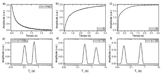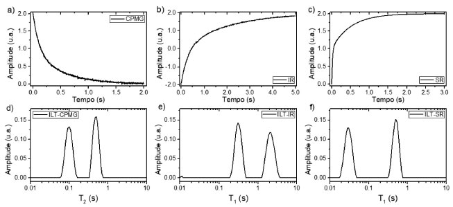 Na Figura 8 apresentamos um resumo da comparação de sinais simulados com os kernels de três experimentos: a) CPMG, b) Inversão Recuperação, c) Saturação Recuperação com diferentes tempos de relaxação. Nas Figuras 8 a)-c) são mostrados os sinais no domínio do tempo, e nas Figuras 8 d)-f) as respecticas distribuições de tempos de relaxação obtida em cada processamento, todos utilizando α = 0,1 e 100 pontos. Todos resultados apresentaram ótima concordância com as distribuições usadas na simulação dos sinais.