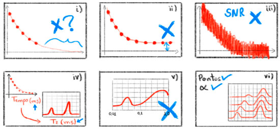 Ao analisar sinais de 1H de uma amostra complexa em espectrômetros de RMN-DT, como por exemplo um pedaço de carne com fibras e gordura, o sinal obtido será formado pela contribuição de todos os spins nucleares dos diferentes 1H presentes na amostra, que estão em diferentes ambientes químicos, com diferentes mobilidades, de modo que todos esses fatores vão influenciar na curva de relaxação resultante, e portanto é esperada a observação de vários tempos de relaxação longitudinal (T1) e transversal (T2) para essa amostra. Nosso enfoque aqui não é discutir os métodos de relaxometria, os quais podem ser consultados nas referências,5-9 mas discutir o processamento dos sinais obtidos por sequências de pulsos tais como Carr-Purcell-Meiboom-Gill (CPMG), Inversão Recuperação (IR), Saturação Recuperação (SR), Continuous Wave Free Precession (CWFP),10,11 entre outras, que resultam em curvas de caráter multi-exponencial, depedentes dos tempos de relaxação T1 e/ou T2. A determinação da contribuição de cada uma dessas componentes presentes no sinal experimental não é trivial, pois trata-se de um problema inverso com sinais ruídosos, matematicamente denominados de 'mal-posto' ou 'mal colocados'.12-14 Uma consequência importante de um problema matemático inverso mal-posto, é que uma pequena variação nos seus valores de entrada pode resultar em uma solução final significativamente diferente, de modo que a inversão de um sinal admite multiplas soluções, sendo necessárias a utilização de métodos matemáticos sofisticados de regularização para seu processamento.15-18 Vale aqui destacar o paralelo da Tranformada Inversa de Laplace (ILT) com a Transformada de Fourier (TF), utilizada na análise dos sinais FID (free induction decay) em espectrômetros de alta resolução. A TF é um problema matemático direto bem-posto, possuindo solução exata e única, portanto tendo comportamento estável, diferente se sua prima ILT.1 A Figura 2 ilustra a problemática envolvida na solução de um problema inverso mal-posto típico na RMN-DT, como é o caso da análise multi-exponencial de sinais CPMG. É comum ao realizar o ajuste (fitting) desse sinal experimental - por exemplo, usando equações com duas ou com três componentes exponenciais - em ambos os casos obtermos um ajuste ótimo dos dados, e nessa situação fica a dúvida ao analista: qual dos dois processamentos descreve melhor o sistema em análise?