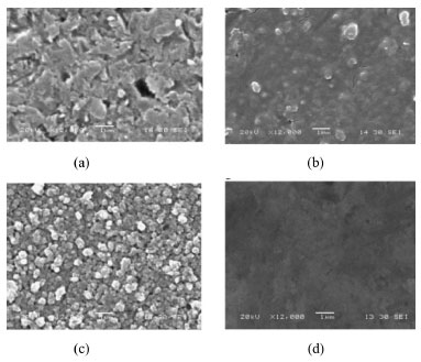 ![]() Figura 4. Micrografias eletrônicas de varredura de alta ampliação da superfície da liga de alumínio AA2024T3 anodizada em meio oxálico com (a) anilina (A2-PA-0), (b) anilina e TiO2 nanopartículas (A2-PA-T1), (c) nanopartículas de anilina e ZrO2 (A2-PA-Z1) e (d) nanopartículas de TiO2 (A2-0-T1)23