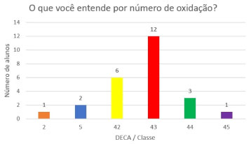 RESULTADOS E DISCUSSÃO Em relação à idade dos participantes desse estudo, observou-se que grande parte dos alunos possuía idade entre 17 e 19 anos, e apenas três alunos possuíam entre 21 e 25 anos. Dentre os 25 acadêmicos, 9 disseram ter estudado toda a educação básica em escola pública, 7 alunos estudaram toda a educação básica em escola privada e 9 disseram ter estudado parcialmente em escola pública e privada. Apenas 7 alunos cursaram pré-vestibulares. A maioria dos alunos (21) concluiu o ensino médio entre 6 meses e dois anos antes da realização do presente estudos. Quando questionados se aprenderam os conceitos de eletroquímica durante a educação básica e sobre os recursos didáticos explorados pelo professor, 16 alunos relataram que aprenderam o assunto na 2ª série do ensino médio. Grande parte dos alunos disse que suas aulas eram baseadas apenas em conceitos teóricos e avaliações pontuais (do tipo prova escrita), com abordagem superficial e descontextualizada. Apenas 2 alunos afirmaram ter tido aulas práticas de química desse conteúdo e 16 disseram que o principal recurso explorado pelo professor era o livro didático (alguns desses estudantes apontaram também o uso do quadro). Além disso, alguns estudantes (4) comentaram que seus professores não eram bem preparados e não explicavam de forma clara e outros (2) disseram que suas aulas de química eram planejadas com foco apenas no Exame Nacional do Ensino Médio e vestibulares, com macetes, fórmulas e conceitos decorados, por meio de uma aprendizagem mecânica. De modo geral, verifica-se que os sujeitos do presente estudo concluíram o ensino médio pouco tempo antes de ingressarem no ensino superior e que, quando tiveram o conteúdo de eletroquímica durante a educação básica, a abordagem realizada pelos professores foi bastante simplória, sem o uso de recursos didáticos diferenciados e, às vezes, com pouco domínio conceitual por parte do docente. Atualmente, muito se discute na literatura sobre a importância de uma abordagem contextualizada, a qual conecta os conceitos químicos vistos em sala de aula com as suas aplicações presentes no cotidiano do estudante. Pela perspectiva dos Parâmetros Curriculares Nacionais para o Ensino Médio (PCNEM),18 contextualizar o ensino de química significa assumir que todo o conhecimento envolve uma relação entre o sujeito e o objeto - logo, a contextualização no ensino de química é um recurso que traz consigo um novo significado aos conceitos ensinados no ambiente escolar, possibilitando ao estudante uma aprendizagem significativa da química. Ainda de acordo com o PCNEM,18 a experimentação faz parte da vida, na escola ou no cotidiano de todos nós. Assim, a ideia de experimentação como atividade exclusiva das aulas de laboratório, onde os alunos recebem uma receita a ser seguida nos mínimos detalhes e cujos resultados já são previamente conhecidos, não condiz com o ensino atual. As atividades experimentais devem partir de um problema, de uma questão a ser respondida. Cabe ao professor orientar os alunos na busca de respostas. As questões propostas devem propiciar oportunidade para que os alunos elaborem hipóteses, testem-nas, organizem os resultados obtidos, reflitam sobre o significado de resultados esperados e, sobretudo, o dos inesperados, e usem as conclusões para a construção do conceito pretendido. As habilidades necessárias para que se desenvolva o espírito investigativo nos alunos não estão associadas a laboratórios modernos, com equipamentos sofisticados. Muitas vezes, experimentos simples, que podem ser realizados em casa, no pátio da escola ou na sala de aula, com materiais do dia-a-dia, levam a descobertas importantes. Em relação à segunda parte do questionário, na questão 1, solicitou-se aos estudantes que explicassem seu entendimento sobre o conceito de número de oxidação (NOX). Na literatura esse conceito é trazido como carga aparente de um átomo em um íon ou molécula, que representa a tendência desse átomo em atrair os elétrons das ligações que ele realiza.19 Os resultados revelaram que 3 alunos deram respostas em que foram identificadas DECAs, 6 alunos não responderam, 12 responderam de forma incorreta sem a identificação de DECAs, 3 escreveram respostas sem relação com o questionamento, e apenas 1 aluno respondeu de forma correta. A Figura 1 apresenta as categorias identificadas nas respostas dos alunos para a primeira questão.