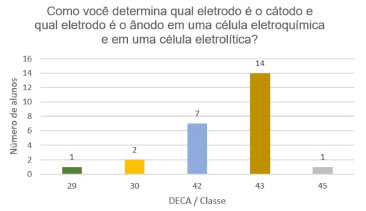 A Figura 1 mostra que a resposta de 1 aluno foi categorizada na DECA 2 ("Em todas as equações, a adição e a remoção de oxigênio podem ser usadas para identificar uma reação de oxidação ou redução") e a de 2 alunos na DECA 5 ("Números ou estados de oxidação podem ser atribuídos a moléculas poliatômicas ou a íons"). Algumas das respostas incorretas fornecidas foram:"Coeficiente do elemento necessário para neutralizarmos a reação";"Nº de perdas de elétrons de um metal"; "Número que se pode encontrar na tabela periódica segundo sua localização". Outras respostas como, por exemplo, "Quantos elétrons vai ganhar ou perder"; "Número de elétrons que o elemento e/ou composto doa ou recebe para que a carga seja neutra" foram consideradas como incorretas por apresentarem explicações incompletas ou pequenos erros que não caracterizam completamente a identificação de alguma DECA. Observou-se que os alunos apresentaram relativa dificuldade em explicar o conceito de NOX, respondendo o que é oxidação e redução ao invés de responder, de fato, o questionamento. Parece que alguns alunos assumem esses conceitos como a própria definição de NOX uma vez que estão diretamente relacionados. Alguns estudantes entendem o NOX como a carga efetiva dos átomos. As respostas dos estudantes indicam também que parece haver uma confusão sobre número de oxidação e número atômico, ou com a carga de íons, bem como sobre o conceito de NOX se aplicar apenas a átomos metálicos, muito usados em exemplos eletroquímicos. As respostas que fugiram do assunto abordado na questão também podem indicar dificuldade dos alunos em definir o conceito de NOX. Quando questionados sobre como determinar qual eletrodo é o cátodo e qual eletrodo é o ânodo nas células galvânicas e eletrolíticas, na questão 2, 3 alunos forneceram respostas em que foram identificadas DECAs, 7 alunos não responderam, 14 alunos responderam de forma incorreta e 1 aluno respondeu corretamente. A Figura 2 representa os resultados da análise das respostas para a segunda questão.