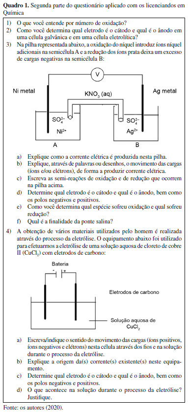 PERCURSO METODOLÓGICO Inicialmente, elaborou-se um questionário, inspirado em uma pesquisa de autores brasileiros,1 que foi validado a partir de uma aplicação piloto realizada com 3 estudantes e posterior discussão com dois professores do ensino superior acerca das readequações necessárias. Após esse processo, o questionário foi aplicado com 25 graduandos de uma turma da primeira fase de um curso de Licenciatura em Química de uma universidade pública de Santa Catarina. A escolha de uma turma da primeira fase se deu pelo fato de que os alunos ainda não teriam estudado o conteúdo de eletroquímica na graduação, de modo que suas respostas trariam basicamente os conhecimentos advindos das vivências anteriores como, por exemplo, as aulas de química no ensino médio e/ou cursos pré-vestibular. O questionário foi elaborado com três partes, sendo que cada uma atenderia a um objetivo específico. Na primeira parte, buscou-se caracterizar o público alvo e conhecer informações básicas como a idade e o tempo que o acadêmico já havia concluído o ensino médio. Além disso, o questionário possibilitou quantificar os alunos provenientes da rede pública e os alunos da rede privada de ensino, e se o indivíduo participou ou não de curso pré-vestibular. Nessa etapa do questionário, o acadêmico pôde informar se teve aulas sobre eletroquímica durante o ensino médio e quais recursos didáticos o seu professor utilizava em suas aulas com o intuito de agregar o processo de ensino e aprendizagem. A segunda parte do questionário é o objeto central da discussão deste trabalho, cujos dados são analisados. O objetivo dessa parte foi de identificar as principais dificuldades, equívocos e concepções alternativas dos estudantes no processo de aprendizagem do conteúdo de oxirredução. O Quadro 1 apresenta as quatro questões que compuseram essa parte do questionário.