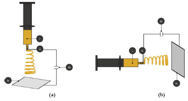 ![]() Figura 2. Diagrama esquemático de um sistema de eletrofiação com: (i) bomba de seringa; (ii) fieira/agulha; (iii) fonte de alta tensão e (iv) coletor aterrado. A alta tensão é aplicada entre a fieira e o coletor aterrado. Em (a) configuração vertical e (b) configuração horizontal