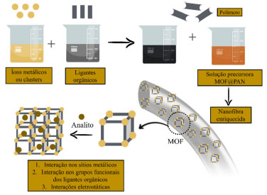 ![]() Figura 6. Ilustração esquemática da obtenção de nanofibras enriquecidas com MOF via Eletrofiação e das interações envolvidas na sorção de analitos