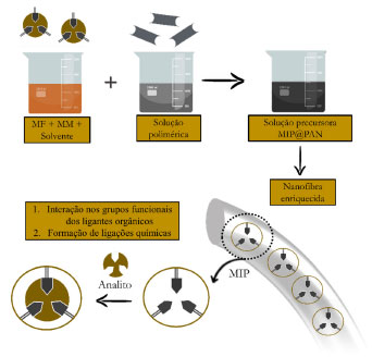 ![]() Figura 7. Ilustração esquemática da obtenção de nanofibras enriquecidas com MIP via Eletrofiação e das interações envolvidas na sorção de analitos