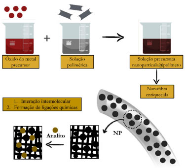 ![]() Figura 8. Ilustração esquemática da obtenção de nanofibras enriquecidas com NP via eletrofiação e das interações envolvidas na sorção de analitos