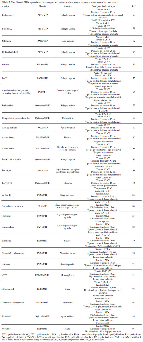 Dessa forma, a abordagem de impressão molecular durante a eletrofiação, embora complexa devido às discrepâncias entre as técnicas, é alcançada por meio da introdução do polímero impresso pré-formado nas matrizes poliméricas a serem eletrofiadas. Contudo, a baixa reticulação tem sido relatada como a maior limitação desses materiais no que tange ao uso como extrator, devido às mudanças estruturais das cavidades seletivas. Alternativamente à reticulação clássica promovida na síntese MIPs, exploram-se as interações entre as principais cadeias poliméricas não reticuladas, além das interações fortes entre o polímero e a molécula molde, garantindo uma distribuição homogênea dos locais de ligação nas nanofibras eletrofiadas.67-69 A Tabela 2 apresenta os principais trabalhos relatados nos últimos anos, visando o desenvolvimento e utilização de nanofibras poliméricas incorporadas com MIPs para aplicações em preparo de amostras/adsorção.