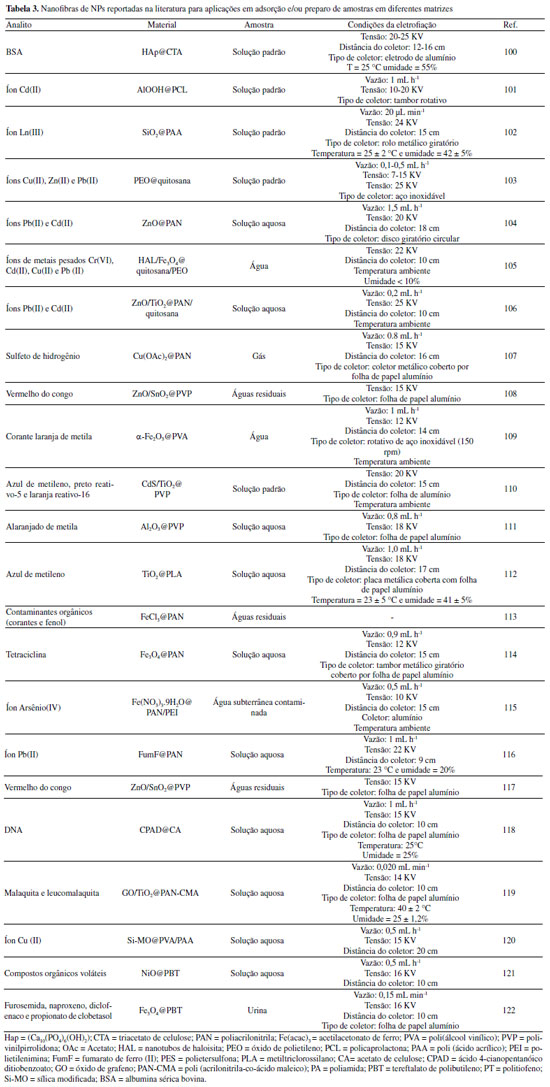 Dentre inúmeras nanofibras enriquecidas com NPs que foram descritas na literatura para diversas aplicações, pode-se destacar nanofibras aplicadas para a determinação de íons Pb(II), Cd(II), Cr(VI), Cu(II), Ln(III), As(IV) e Zn(II). Trabalhos como o de Hota e col., Wang e col. e Shariful e col. descreveram o desenvolvimento de materiais poliméricos enriquecidos com NPs para extração dos íons em solução padrão.101-103 Em 2018, Haddad e Alharbi relataram um aumento nas capacidades de adsorção dos íons Pb(II) e Cd(II) de soluções aquosas utilizando nanofibras de poliacrilonitrila enriquecidas com ZnO.104 No mesmo ano, Li e col. relataram o desenvolvimento de fibras compostas por óxido de polietileno/quitosana, enriquecidas com nanotubos de haloisita e óxido de ferro (Al2Si2O5(OH)4)/Fe3O4), cujos materiais apresentaram grande área de superfície específica e propriedades superparamagnéticas com alta eficiência para extração de metais pesados em água.105 Recentemente, Alharbi e col. desenvolveram membranas de nanofibras funcionalizadas com óxidos metálicos para adsorção de Pb(II) e Cd(II). Em estudos de adsorção, os autores demonstraram após a otimização parâmetros como pH da solução, concentrações iniciais de íons e tempo de interação, recuperações próximas de 100% para ambos os íons.106 Trabalhando com amostras gasosas, Bajaj e col. desenvolveram nanofibras de carbono ativado enriquecido com NPs de óxido de cobre para adsorção de sulfeto de hidrogênio. O material foi sintetizado, caracterizado e aplicado em testes de adsorção. Os autores relataram que o material funcionalizado exibiu um aumento significativo na capacidade de adsorção quando comparado com o suporte polimérico puro.107 Para purificação de águas residuais, Chen e col. estudaram nanofibras de polivinilpirrolidona enriquecidas com ZnO/SnO2, aplicadas para fotodegradação do corante vermelho do congo. Os autores relataram que capacidade de fotodegradação do corante pelo material pode ser atribuída à alta capacidade de adsorção, proveniente da forte interação eletrostática entre as NPs incorporadas e o corante vermelho do Congo.108 Nesse mesmo sentido, Gao e col., Pant e col., Shen e col. e Zhou e col. sintetizaram nanofibras visando a adsorção de corantes em água. Gao e col. produziram nanofibras de PVA incorporadas com NPs de α-Fe2O3, com eficiente adsorção de laranja de metila, Pant e col. relataram o estudo de nanofibras de PVP incorporadas com NPs de CdS/TiO2 suportadas em nanofibras de carbono para alta eficiência de adsorção e decomposição simultânea de azul de metileno, preto reativo 5 e laranja reativo 16.109,110 Já Shen e col. trabalharam com nanofibras de PVP enriquecidas com alumina mesoporosa para aplicação na adsorção do corante laranja de metila. O material apresentou um bom desempenho na adsorção do corante, além de estrutura altamente estável e boa reutilização.111 Zhou e col. desenvolveram membrana nanofibrosas de PVA revestida com TiO2 para separação de óleo/água e adsorção de azul de metileno. Os autores obtiveram alto fluxo de permeação e boa eficiência de filtração ideal.112 Demirci e col. tiveram por objetivo a adsorção de DNA através da modificação de nanofibras de acetato de celulose. Após sintetizado e caracterizado, foram feitos estudos de adsorção e reutilização do material, cujos resultados sugeriram o potencial das nanofibras para aplicações biotecnológicas.118 Bagheri e col. também sintetizaram nanocompósito eletrofiados incorporados com Fe3O4 para extração sob campo magnético de furosemida, naproxeno, diclofenaco e propionato de clobetasol. O método foi validado visando a determinação dos fármacos selecionados em amostras de urina e os resultados indicaram que este método tem potencial suficiente para enriquecimento e determinação dos analitos na amostra de urina obtendo recuperação na faixa de 78-91%.122