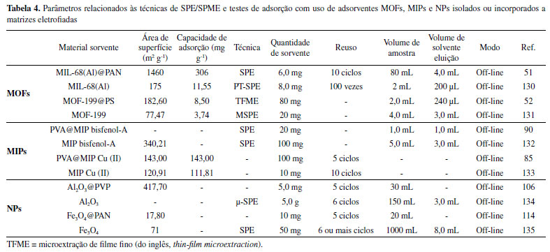 Em 2018, Yan e col. destacaram que nanofibras são suportes ideais para as MOFs, por propiciarem a formação de redes em 3D, evitando a agregação das partículas, melhorando a dispersão e disponibilizando mais sítios ativos para adsorção. Além disso, os autores destacaram serem necessários menores volumes de solventes de eluição e menor quantidade de material sorvente na extração.136 Recentemente, Wang e col. destacaram que a eletrofiação de materiais enriquecidos com MOFs, comparada com outros métodos de síntese, requer menor consumo de reagentes, demonstrando a vantagem ecológica da técnica.137 De acordo com os dados apresentados na Tabela 4, verifica-se que os materiais eletrofiados a base de PAN e PS enriquecidos com MIL-68(Al) e MOF-199, respectivamente, apresentam maiores valores de área superficial e capacidade de adsorção que os materiais isolados. Além disso, comparando o uso das técnicas de microextração de filme fino (TFME) e SPME, confirmam-se consumos menores de volume de amostra e solvente de eluição ao se empregar materiais eletrofiados. Patel e col. realçaram o desafio de unir as técnicas de eletrofiação e impressão molecular, utilizando de nanofibras como suportes para MIPs, produzindo materiais enriquecidos de alta estabilidade e robustez, aumentando, ainda, a limitada capacidade de adsorção e taxa de transferência de MIPs.138 Novamente, de acordo com os dados apresentados na Tabela 4, pode-se verificar que o material eletrofiado a base de PVA, enriquecido com polímero de impressão de íon Cu(II), apresenta maior área superficial e capacidade de adsorção que os materiais isolados, exigindo menor quantidade de material sorvente, volume de amostra e solvente de eluição em SPE com uso de PVA@MIP bisfenol-A, quando comparado com SPE com MIP bisfenol-A. Já Bagheri e col. evidenciaram que a incorporação de NPs em matrizes poliméricas conduz à obtenção de melhores propriedades mecânicas e térmicas,139 além de Feizbakhsh e col. proporem que incorporação de NPs a suportes poliméricos reduz a agregação nas NPs, melhorando sua dispersão na matriz e fornecendo superfícies ativas para interagir com moléculas alvos.140 Ainda de acordo com os dados apresentados na Tabela 4, podem-se evidenciar áreas superficiais maiores para de materiais eletrofiados a base de PVP e PAN, enriquecidos com Al2O3 e Fe3O4, respectivamente, quando comparados com os óxidos puros.