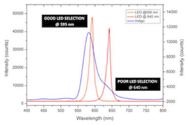 ![]() Figure 3. Representation of the emission spectra of two LEDs (595 and 640 nm) and the absorption spectrum of an indigo solution
