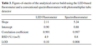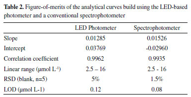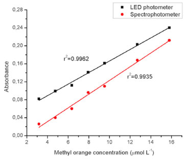 ![]() Figure 4. Analytical curves obtained using the LED-based photometer and a conventional spectrophotometer