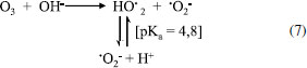 O PODER OXIDANTE DO OZÔNIO EM MEIO AQUOSO O ozônio é moderadamente solúvel em água (12 mg dm-3; 25 ºC), além de formar uma solução pouco estável na sua forma dissolvida. Parte dele é perdido por evaporação e outra parte por reações em cadeia com moléculas de água. Inicialmente, o ozônio reage com os íons OH- da água para formar os radicais HO2 e O2- (equação 7), que subsequentemente participam de uma série de reações radicalares em cadeia. O radical hidroxila (HO) e as moléculas de ozônio dissolvidas são as principais espécies envolvidas em diferentes reações de oxidação da matéria orgânica presente no meio aquoso.34 ![]() Além da geração de um poderoso oxidante (HO), o ozônio solúvel na água reage com compostos aromáticos e alifáticos insaturados, polissacarídeos, álcoois, ácidos graxos insaturados, nucleobases e também pode reagir com H2O2, Fe3+, HO- e/ou radiação UV, dando início aos processos de oxidação avançados (POA), que são amplamente empregados na degradação da matéria orgânica.35 Inúmeros trabalhos descrevem os processos que ocorrem na solubilização do ozônio na água e suas reações diretas e indiretas. Portanto, a qualidade da água, bem como a presença de íons metálicos, substâncias orgânicas e o pH devem ser rigorosamente controlados; caso contrário, uma grande quantidade de produtos indesejáveis pode estar presente no meio.