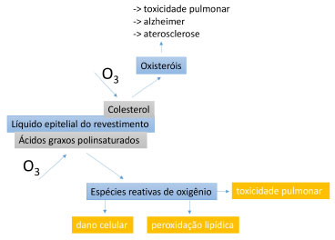 CONSEQUÊNCIAS DA REATIVIDADE DO OZÔNIO O ozônio apresenta elevada atividade oxidante, reagindo vigorosamente com compostos orgânicos contendo duplas ligações, para formar compostos denominados ozonídeos, que, por serem bastante instáveis, são rapidamente convertidos a compostos carbonílicos (aldeídos e cetonas). Essas características conferem ao ozônio intensa reatividade com diversos materiais e, inclusive, com sistemas biológicos.51,52 Em solução aquosa, o ozônio forma os radicais HO2 e O2-, que reagem com a matéria orgânica, promovendo sua degradação. A presença de íon metálicos, radiação UV, meio alcalino e outras variáveis podem acelerar os processos de oxidação da matéria orgânica.53 Saúde humana No ser humano, a principal via de entrada dos poluentes atmosféricos é através do trato respiratório. O mecanismo de atuação desses poluentes depende das características químicas e físicas das espécies e da sua interação com os componentes biológicos. No caso do O3, os principais efeitos ocorrem pelo contato com as vias aéreas e mucosas. Seus alvos são as estruturas insaturadas, como moléculas de ácidos graxos e de proteínas, que são constituintes das membranas biológicas. Desse modo, a exposição ao O3 pode causar danos a todas as células do trato respiratório;54 porém, isso depende da concentração do gás e do tempo de exposição. Os efeitos podem assumir caráter agudo ou crônico, ambos constatados em estudos epidemiológicos.1,17 Os efeitos da exposição aguda mais importantes são: lesões celulares (principalmente na região alveolar), morte das células pulmonares e aumento das taxas de replicação (hiperplasia), decréscimo na atividade pulmonar, inflamação das vias respiratórias e aparecimento de sintomas como tosse, dor no peito, dificuldade em realizar movimentos inspiratórios profundos e, por vezes, acompanhado de cefaleia e náuseas.55 Dentre os efeitos crônicos, os mais estudados são a incidência de asma e o câncer de pulmão.56 Relatos da literatura mostram que a exposição prolongada ao O3, via inalação, danifica o sistema respiratório e órgãos extrapulmonares.57 Lesões epiteliais induzidas por O3 são também amplamente discutidas e os principais resultados apontam para danos e alterações morfológicas nas células epiteliais pulmonares.58 Além disso, a permeabilidade alveolar (danificação da superfície epitelial) foi confirmada pelo aparecimento de células de Clara na corrente sanguínea, visto que essas células estão originalmente presentes na superfície do pulmão.10,59 Esses dados são preocupantes, uma vez que indicam a permeação do ozônio através do epitélio, mostrando que a atividade antioxidante pode não ser suficientemente efetiva em sua neutralização. Resultados recentes indicam que até mesmo concentrações 40 vezes menores que as consideradas seguras pelas agências ambientais, em um intervalo de tempo de 2h (i.e., 0,05 e 0,005 ppm), influenciam negativamente o sistema respiratório, desencadeando uma série de anomalias e resposta inflamatória em camundongos.12 O efeito do ozônio em contato com a pele também já foi avaliado por diversos autores e os estudos confirmaram a perda dos antioxidantes presentes na pele, através de um intenso estresse oxidativo.60 Esses efeitos podem ser intensificados em pessoas que vivem em países tropicais com alta incidência de raios solares, onde a radiação UV e a presença de O3 são significativas. O contato do O3 com os fluidos epiteliais promove a ozonólise (via mecanismo de Criegee),51,53 ao reagir com os ácidos graxos insaturados e colesterol, podendo gerar espécies reativas de oxigênio.51,52 Essas espécies promovem a formação de aldeídos e radicais livres por meio da peroxidação lipídica (hidroxi-5-oxo-5,6-secocolestan-6-al (colesterol secoaldeído), produto majoritário), que está relacionada aos diagnósticos da doença de Alzheimer, aterosclerose e também a toxicidade pulmonar (Figura 1).61,62 Prior W. A.51 relata que provavelmente os danos causados pelo O3 correspondam a no máximo 50 % dos efeitos totais (toxicidade direta), e que as espécies geradas durante a oxidação (i.e., aldeídos, peróxido de hidrogênio e outras) são responsáveis pela outra parte.