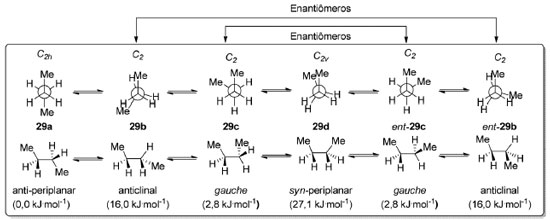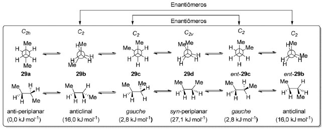 ![]() Esquema 3. Simetria e energias das conformações do n-butano (29). Nível de teoria utilizado para os cálculos de ΔG°: QCISD-(T)/6-311+G(3df,2pd)63