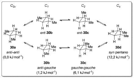 ![]() Esquema 4. Simetria e energias das conformações do n-pentano (30). Nível de teoria utilizado para os cálculos de ΔG°: CCSD(T)(full)/cc-pVTZ)64
