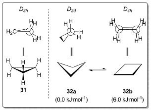 ![]() Esquema 5. Simetria e energias das conformações do ciclopropano (31) e do ciclobutano (32). Nível de teoria utilizado para os cálculos da barreira rotacional do ciclobutano (32) CCSD(T)/cc-pVQZ.68