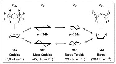 Diferente dos cicloalcanos menores, o cicloexano (34) não apresenta tensão angular na sua conformação cadeira 34a (D3d) que é a mais estável (Esquema 7). Neste confôrmero, todos os carbonos apresentam uma conformação alternada o que minimiza a tensão torsional. À temperatura ambiente, praticamente todas as moléculas de cicloexano se encontram na conformação cadeira (> 99,9%).73 O outro confôrmero que corresponde a um mínimo de energia é o barco torcido (D2), observado na forma de dois enantiômeros, 34c e ent-34c, sendo 23,9 kJ.mol-1 mais elevado em energia que a conformação cadeira 34a (D3d).74 A interconversão entre os confôrmeros cadeira 34a e barco torcido (34c e ent-34c) passa por um máximo de energia (45,3 kJ.mol-1) referente à conformação meia cadeira, 34b e ent-34b, de simetria C2.75 Nessa conformação, quatro carbonos estão coplanares enquanto os dois carbonos restantes se encontram acima e abaixo deste plano.76 A conformação barco 34d, de simetria C2v corresponde a um máximo de energia (30,4 kJ.mol-1) referente à barreira de interconversão entre os confôrmeros barco torcido 34c e ent-34c (D2).