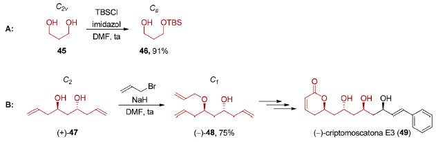 Na dessimetrização não-estereosseletiva, encontramos situações onde a quebra de simetria de uma molécula aquiral não leva à formação de uma molécula quiral como, por exemplo, na monoproteção do 1,3-propanodiol (45), (grupo pontual C2v), com TBSCl levando à formação do álcool 46 (grupo pontual: Cs, Esquema 12A).82
