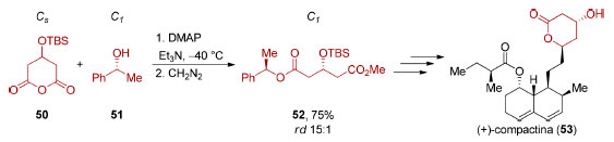 ![]() Esquema 14. Dessimetrização aplicada à síntese da (+)-compactina (53), por Heathcock e Rosen88