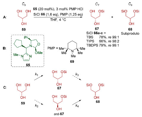 Tan e colaboradores100 desenvolveram uma reação de dessimetrização enantiosseletiva do glicerol (59, Esquema 17A) utilizando um organocatalisador capaz de se ligar reversivelmente a umas das hidroxilas do glicerol (59, Esquema 17B) e dirigir a etapa de sililação de forma intramolecular. A etapa de dessimetrização fornece o enantiômero 67 com uma seletividade de aproximadamente 9:1 (já que k1 é maior do que k2), mas que pode ser enriquecido por uma resolução cinética na qual o enantiômero minoritário (ent-67) é parcialmente consumido (já que k4 é maior do que k3, Esquema 17C), formando o subproduto bis-sililado 68.