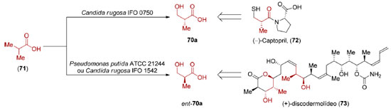 Os ácidos (R)- e (S)-β-hidroxi isobutíricos (70 e ent-70) são compostos muito utilizados como materiais de partida na síntese de produtos naturais e fármacos, sendo que suas preparações a partir da dessimetrização enzimática do ácido isobutírico (71) foram adaptadas à escala industrial (Esquema 18).