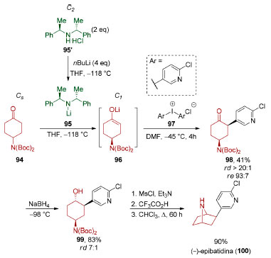 Mesmo reações fundamentais, como a enolização, podem ser utilizadas para viabilizar reações de dessimetrização. Em 2005, Aggarwal e Olofsson demonstraram que a cicloexanona proquiral 94 poderia sofrer desprotonação enantiosseletiva (Esquema 23),110 na presença de uma amida de lítio quiral 95, e o enolato formado 96 interceptado in situ, utilizando-se o sal de diaril-iodônio 97, resultando no produto de α-arilação 98 (41%), em alta estereosseletividade (rd > 20:1, re 93:7), que foi submetido a uma redução diastereosseletiva da carbonila (rd 7:1, 83%). A conversão do álcool 99 em um mesilato, seguida por uma clivagem ácida do grupo de proteção, viabilizou a formação de uma amina livre. Uma reação de substituição nucleofílica transanular (90%) completou a síntese da (−)-epibatidina (100).