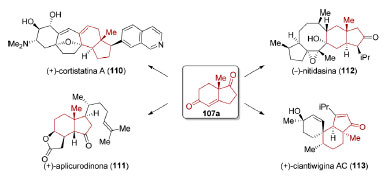 Para n=1 (Esquema 26), a cetona obtida é conhecida como cetona de Hajos-Parrish-Eder-Sauer-Wiechert (107a)114 e foi empregada na síntese total de diversos produtos naturais, especialmente terpenóides como, por exemplo, (+)-cortistatina A (110),115 aplicurodinona-1 (111),116 (−)-nitidasina (112),117 (+)-ciantiwigina AC (113),118 entre vários outros.119 Uma razão para tamanha aplicabilidade é a presença do sistema de anéis de cinco e seis membros fundidos em um vasto número de produtos naturais.