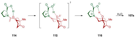 A reação de ciclização entre uma 1,3-dicetona cíclica 105 e uma cetona α,β-insaturada 104, um caso particular de uma anelação de Robinson que envolve uma adição de Michael, seguida por uma condensação aldólica intramolecular para formar o sistema bicíclico 107 contendo um estereocentro quaternário que oferece a oportunidade de dessimetrização.112 Em 2000, Barbas e colaboradores demonstraram a generalidade de uma anelação de Robinson assimétrica catalisada por prolina (106, Esquema 25).113
